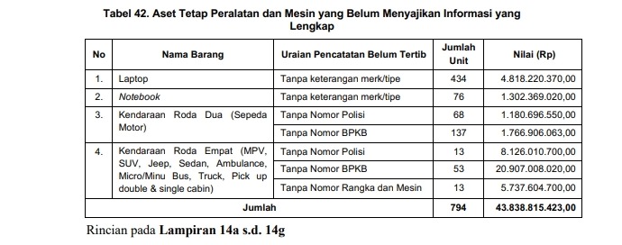 c.Hasil pemeriksaan atas KIB B per 31 Desember 2022 diketahui bahwa terdapat aset tetap – peralatan mesin jenis kendaraan dinas dan komputer yang tidak mencantumkan informasi mengenai Nomor mesin, Nomor rangka, Nomor buku pemilik kendaraan bermotor (BPKB), Nomor plat kendaraan dan merk senilai Rp43.838.815.423,00, sebagaimana yang telah dimuat dalam LHP LKPD Kabupaten Padang Lawas Utara TA 2020 Nomor 41.B/LHP/XVIII.MDN/04/2021 Gedung dan Bangunan