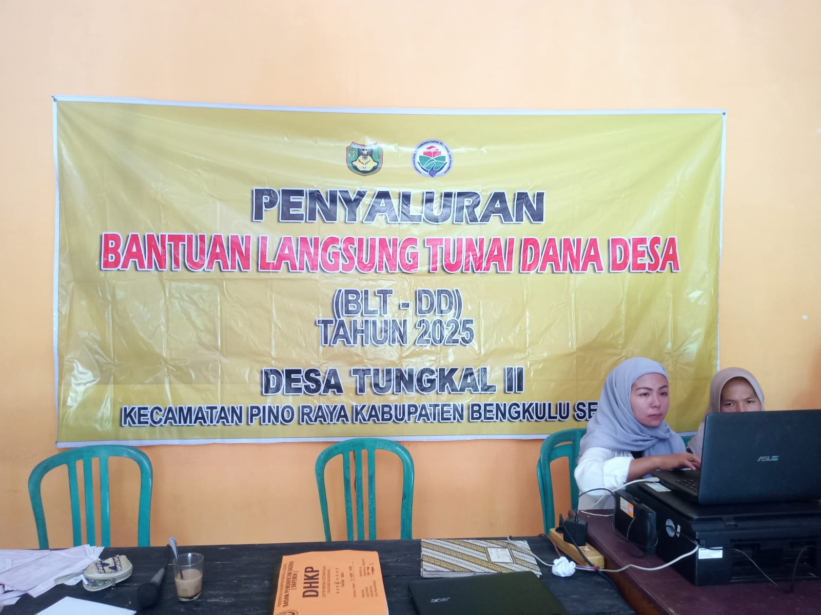 Penyaluran Bantuan Lansung Tunai Dana Desa Tungkal Dua. Pada tanggal 03Juni 2025 tahap 7, 8 dan 9 jumlah KPM 10 KK. Keluarga penerima manfaat menghadiri undangan pemerintah desa dalam rangka mendengar penyampaian dan nasihat dari kepala desa tentang penggunaan BLT DD yang di bagikan.