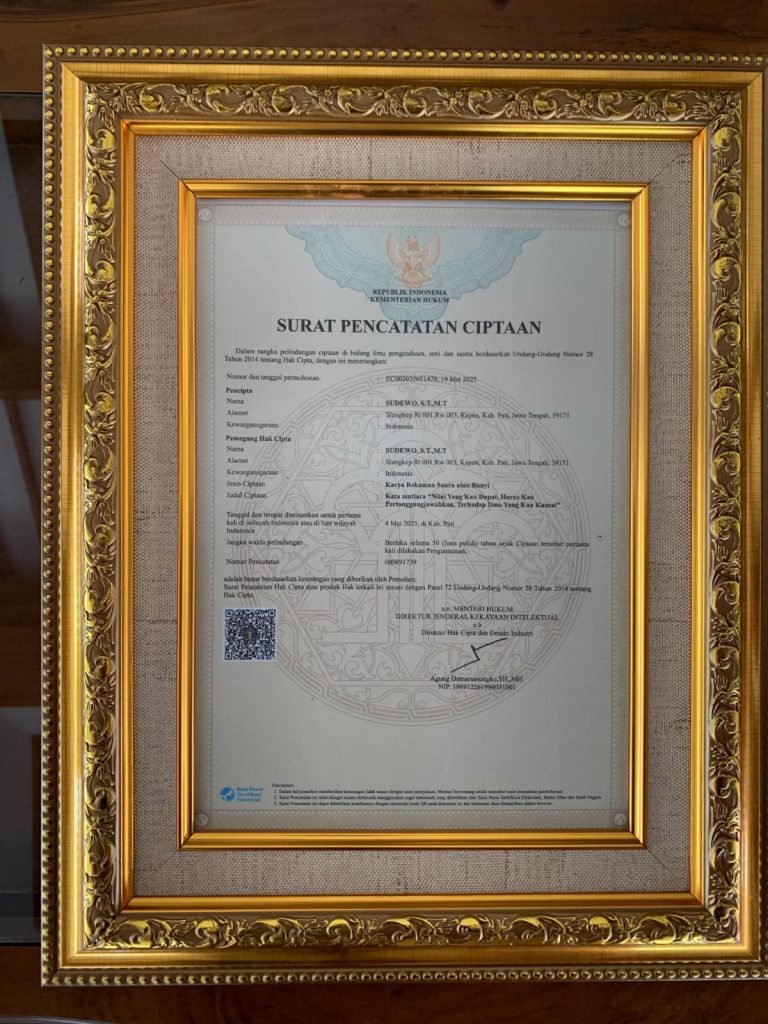 Sertifikat hak paten itu diberikan kepada Bupati Sudewo atas kata-kata mutiara yang disampaikannya sebagai motivasi untuk meningkatkan kualitas pendidikan di Kabupaten Pati.