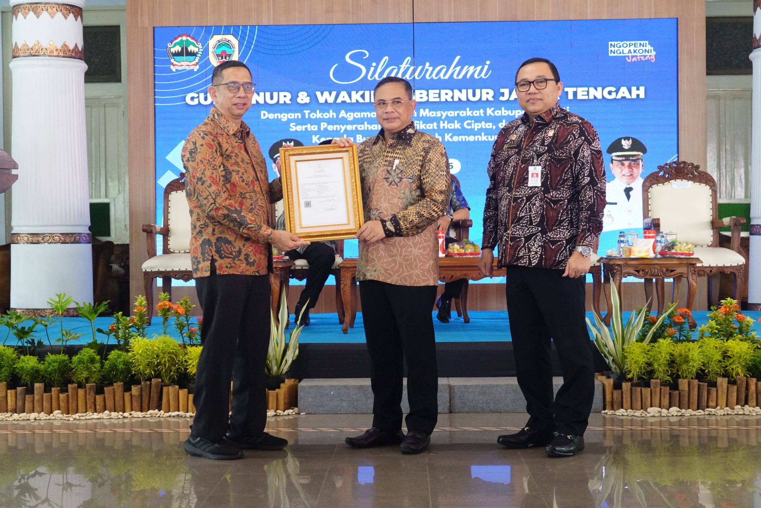 Bupati Pati Sudewo menerima sertifikat atas hak dan kekayaan intelektual dari Direktur Jenderal Kekayaan Intelektual (Dirjen KI) Kementerian Hukum (Kemenkum) RI.