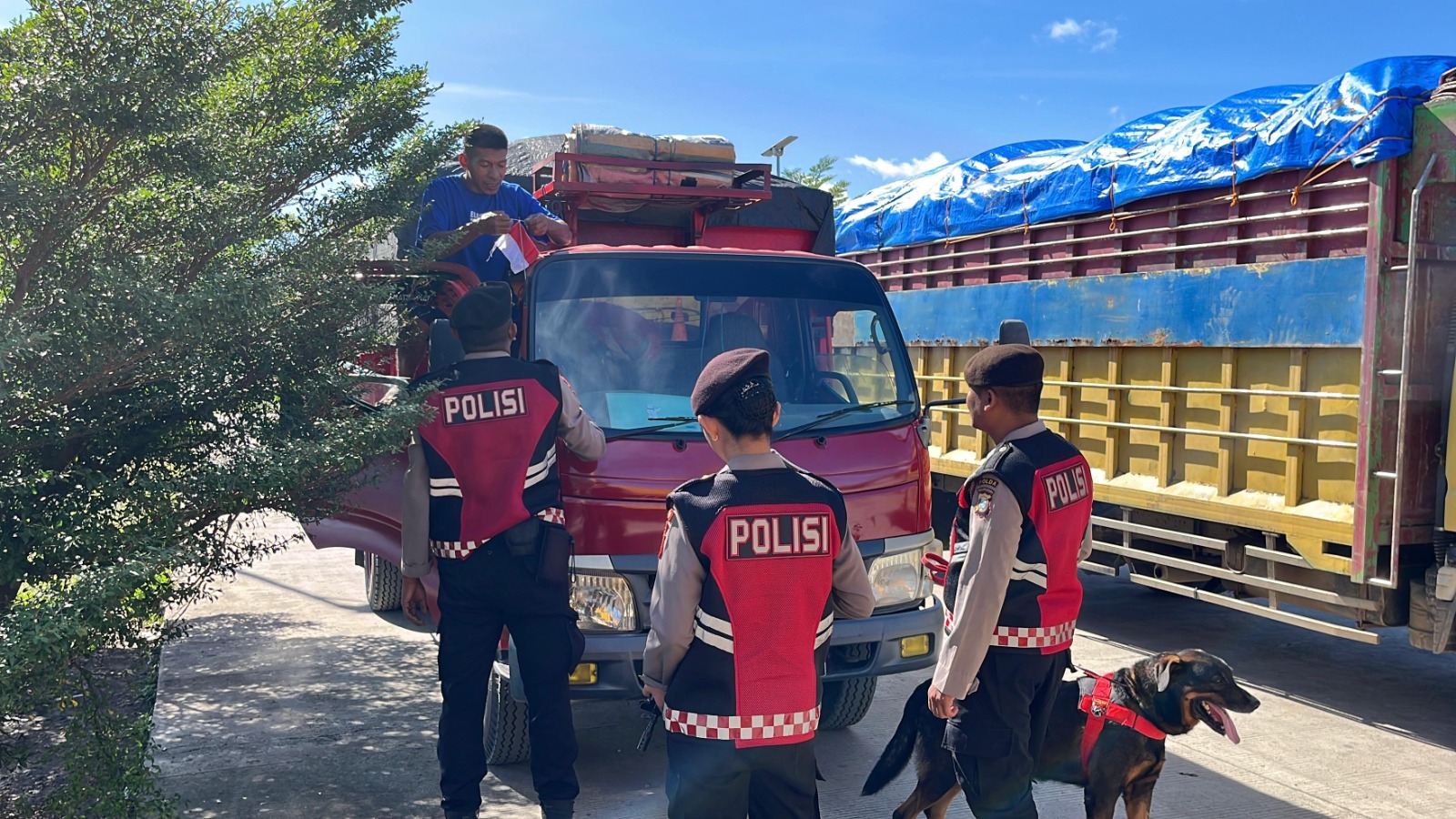 Menyambut Hari Ulang Tahun Ke-80 Kemerdekaan Republik Indonesia, Direktorat Samapta Polda Maluku Utara melalui Unit Satwa K-9 melaksanakan kegiatan patroli rutin sekaligus membagikan bendera merah putih kepada masyarakat, khususnya pengguna kendaraan di Terminal Angkutan Darat Lintas Halmahera, Sofifi, Rabu (6/8).