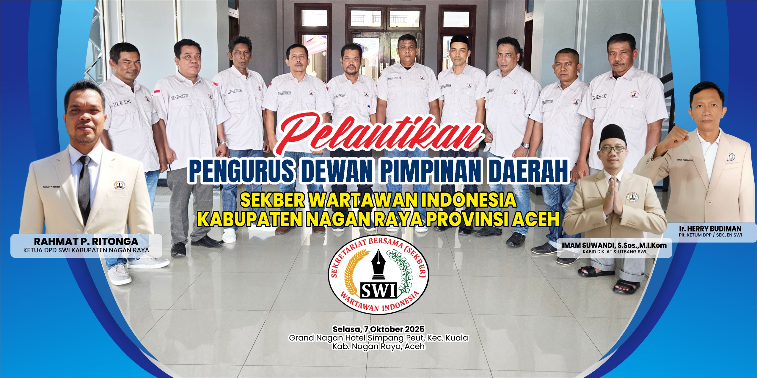 KABUPATEN NAGAN RAYA – Pelaksana Tugas Ketua Umum sekaligus Sekretaris Jenderal Sekretariat Bersama Wartawan Indonesia (SWI) Ir. Herry Budiman melantik Dewan Pimpinan Daerah (DPD) Sekber Wartawan Indonesia ( SWI) Nagan Raya, Aceh yang digelar di Aula Grand Nagan Hotel, Peut, Simpang Peut Kecamatan Kuala Kabupaten Nagan Raya, Aceh pada, Selasa 7 Oktober 2025.