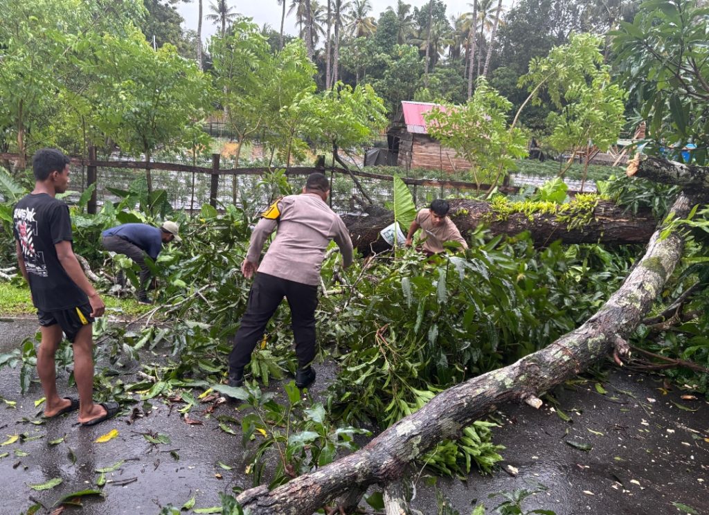 Menanggapi hal tersebut, Kapolsek Oba Utara, Ipda Suherlin, S.IP., M.H., bersama masyarakat sekitar, melakukan upaya pembersihan pohon tumbang.