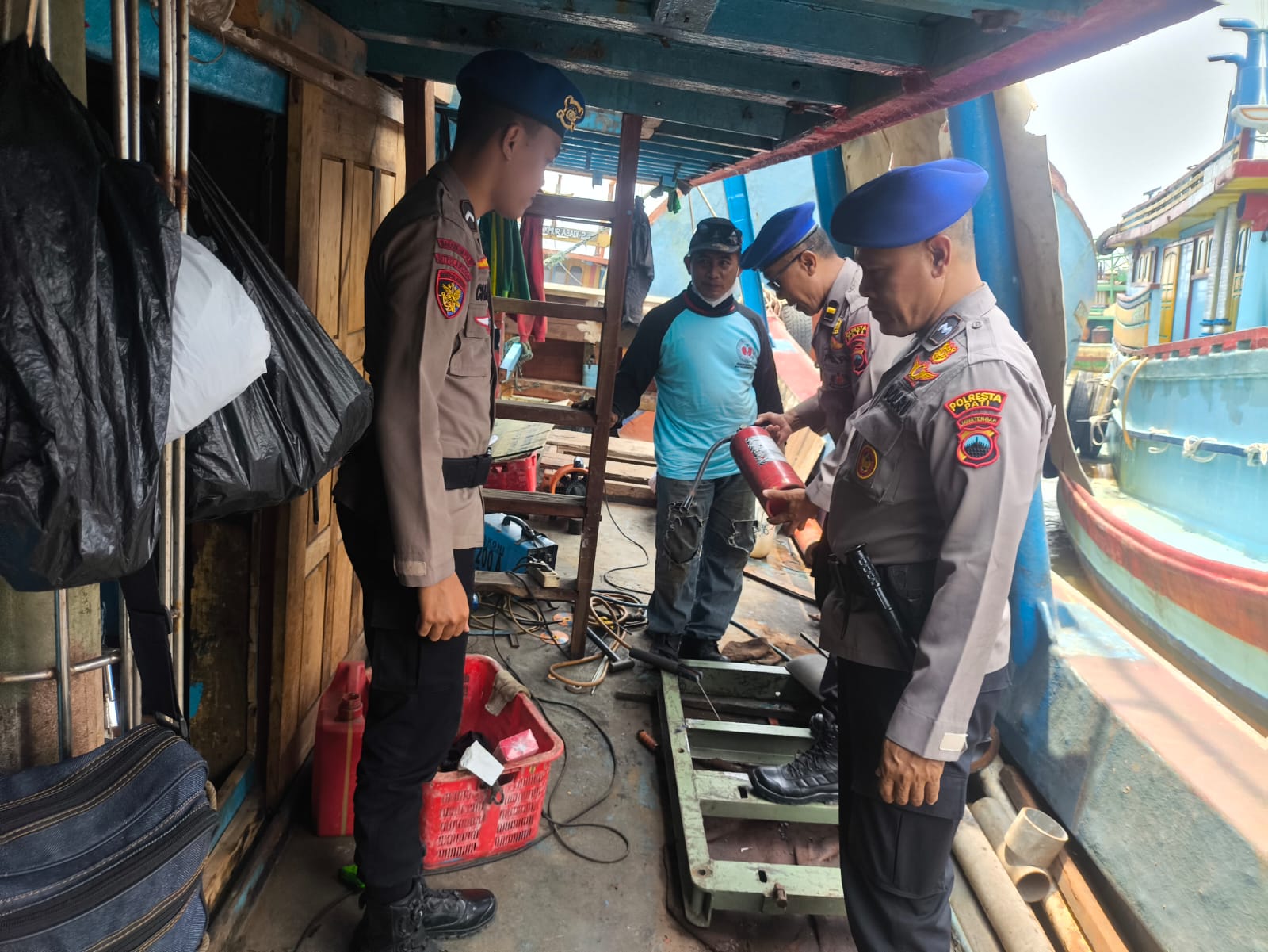 PATI – Senin, 29 September 2025, pukul 11.20 WIB hingga selesai, Satpolairud Polresta Pati melaksanakan kegiatan inovatif Si Pola Cekal (Polisi Polairud Cegah Kebakaran Kapal) di wilayah alur Sungai Silugonggo Juwana. Kegiatan ini difokuskan pada patroli dan pengecekan alat pemadam kebakaran serta pemberian himbauan kamtibmasair kepada para pekerja kapal, khususnya yang melakukan pekerjaan panas seperti pengelasan dan penggerindaan.