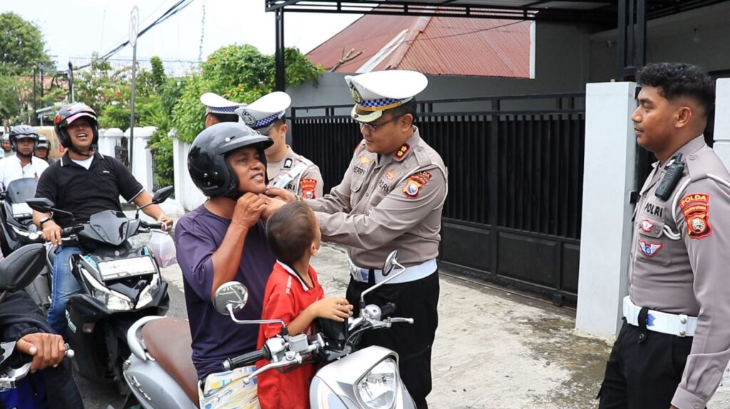 Tak hanya berbagi, petugas juga memberikan imbauan kepada masyarakat agar selalu tertib dalam berlalu lintas, seperti menggunakan helm bagi pengendara roda dua.