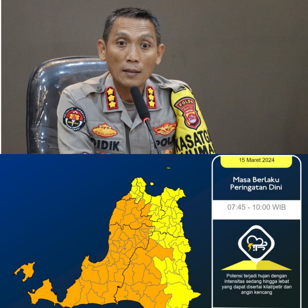 Serang – Polda Banten menyampaikan imbauan kepada masyarakat terkait waspada cuaca ekstream berdasarkan informasi Badan Meteorologi Klimatologi dan Geofisika (BMKG) dengan perkiraan cuaca wilayah Banten berpotensi terjadi hujan sedang-Lebat yang dapat disertai kilat/petir dan angin kencang pada Jumat (15/03).