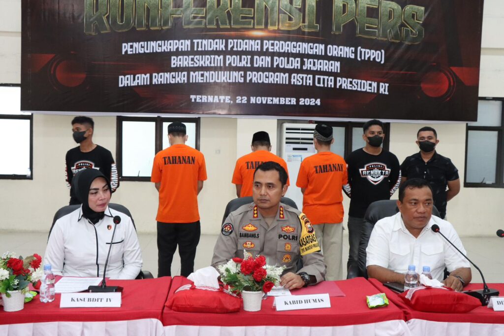 Kepolisian Daerah Maluku Utara melalui Dit Reskrimum Polda Maluku menggelar Konferensi Pers pengungkapan kasus tindak pidana perdagangan orang yang bertempat di Aula Mapolda Malut. Jumat (22/11).