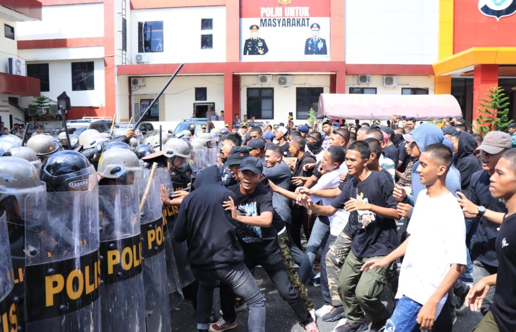 HUMAS POLDA MALUT — Kepolisian Daerah Maluku Utara menggelar simulasi penanganan unjuk rasa serta taktikal floor game (TFG) di Lapangan Apel Mapolda Maluku Utara, Selasa, (22 /4/2025).