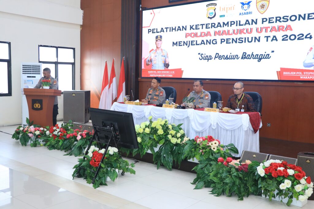 Karo SDM Polda Malut, Kombes Pol Taovik Ibnu Subarkah, S.I.K, mewakili Kapolda Maluku Utara, membuka kegiatan pelatihan keterampilan bagi personel Polri Polda Malut yang akan memasuki masa pensiun T.A 2024, pada Kamis (10/10/2024).