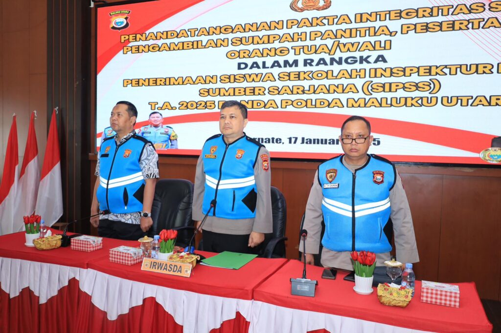 Pada Jumat (17/1/2025), Polda Maluku Utara menggelar penandatanganan pakta integritas dan pengambilan sumpah panitia seleksi penerimaan Siswa Sekolah Inspektur Polisi Sumber Sarjana (SIPSS) Tahun Anggaran 2025.