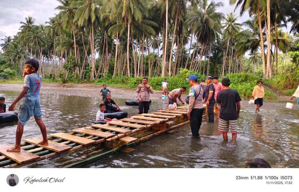 Kapolsek Obi Selatan, IPDA Samsudin Upara, S.H., memimpin langsung kegiatan tersebut bersama sejumlah personel Polsek dan warga sekitar. Mereka bergotong royong mengumpulkan bahan kayu serta drum pelampung untuk membuat rakit sederhana yang kuat dan aman digunakan.