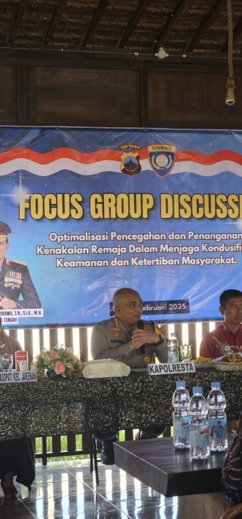 Polresta Pati – Polda Jateng | Polresta Pati menggelar Focus Group Discussion (FGD) bertajuk “Optimalisasi Pencegahan dan Penanganan Kenakalan Remaja dalam Menjaga Kondusifitas Keamanan dan Ketertiban Masyarakat Tahun 2025” pada Kamis, 13/02/ 2025 pukul 08.00 di Warung Makan Joyo 999 Jakenan, Pati. Kegiatan ini dihadiri oleh berbagai pihak terkait, termasuk kepolisian, pemerintah daerah, sekolah, dan tokoh masyarakat.