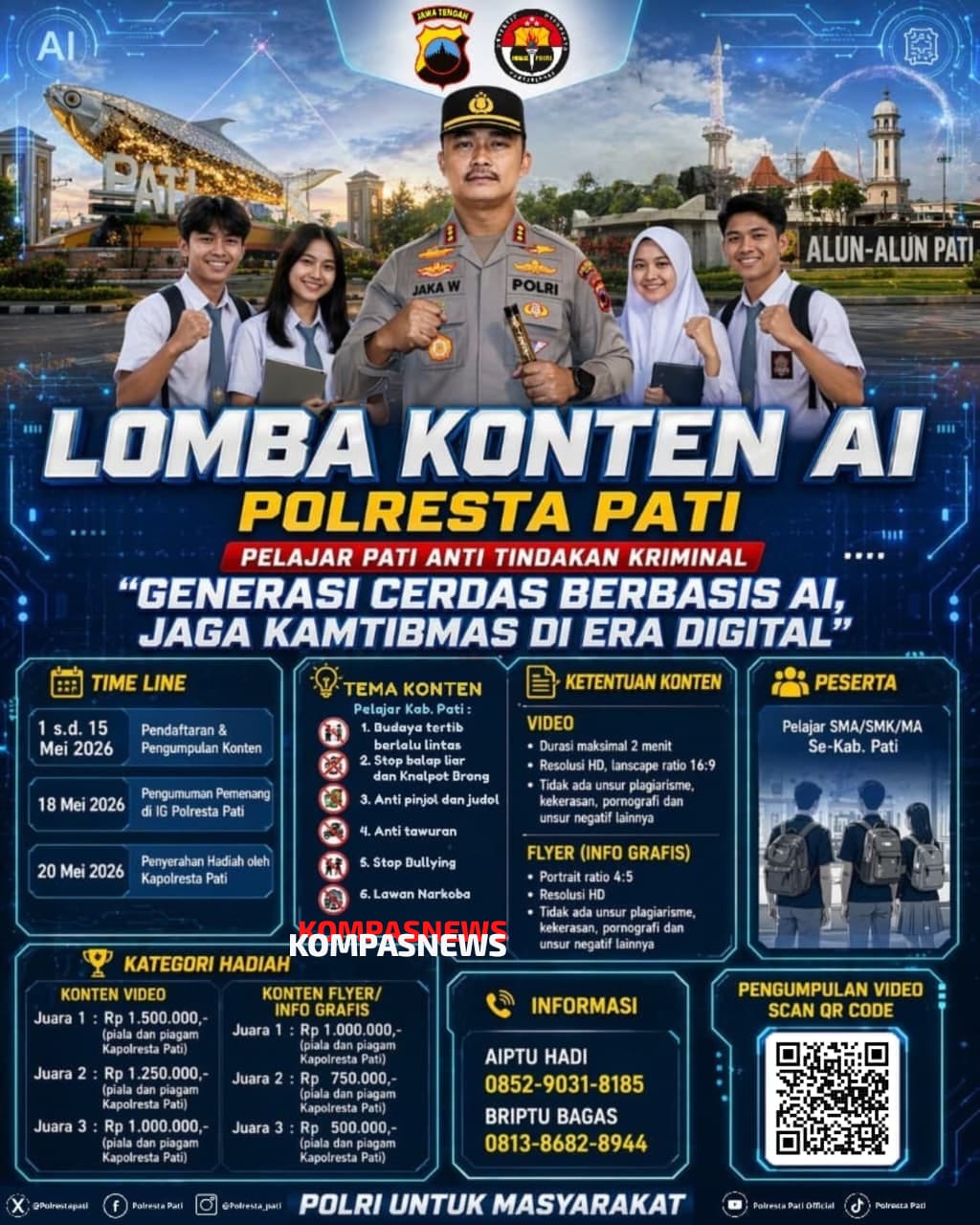 Pati Jawa Tengah Polresta Pati kembali menghadirkan inovasi kreatif dengan menggelar Lomba Konten AI 2026 yang menyasar pelajar SMA/SMK/MA se-Kabupaten Pati. Kegiatan ini menjadi upaya konkret kepolisian dalam mengedukasi generasi muda agar mampu memanfaatkan teknologi kecerdasan buatan secara positif sekaligus berperan aktif menjaga kamtibmas di era digital.