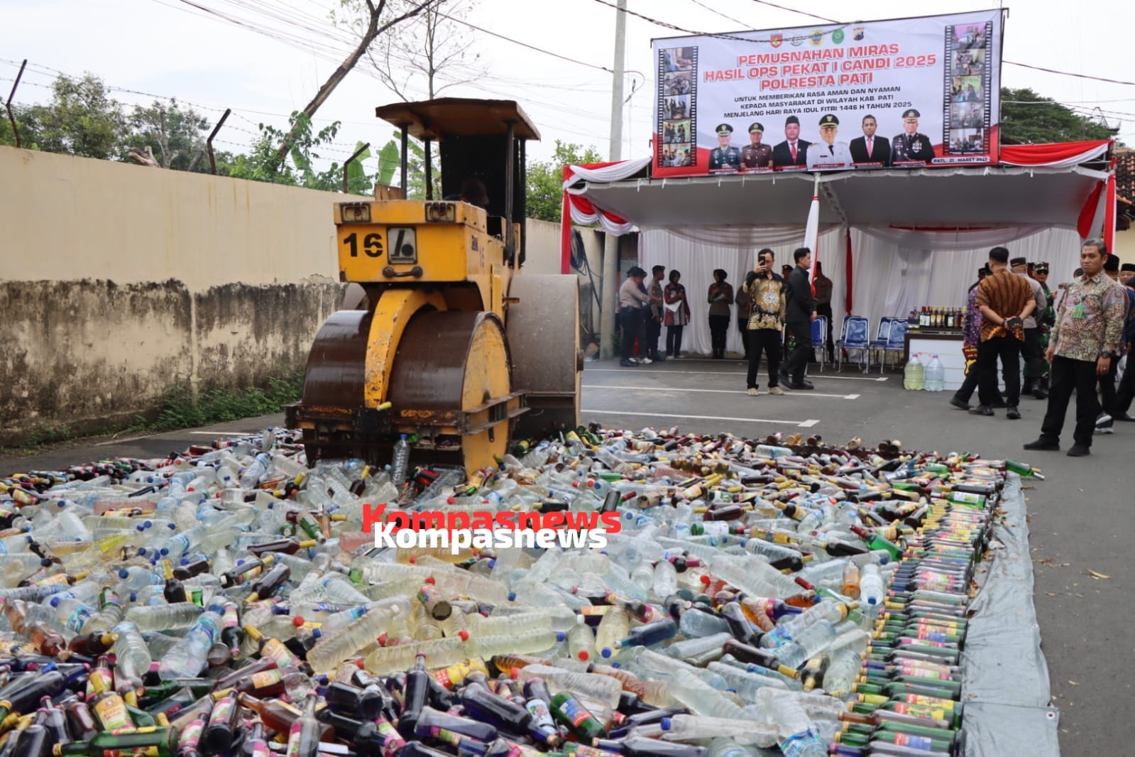Polresta Pati – Polda Jateng | Polresta Pati memusnahkan ribuan botol minuman keras (miras) hasil operasi penyakit masyarakat (pekat) yang berlangsung selama 20 hari, mulai dari 1 Maret 2025 hingga 20 Maret 2025. Pemusnahan ribuan botol miras tersebut dilaksanakan di halaman Polresta Pati pada Jumat, 21 Maret 2025, dengan dihadiri oleh jajaran Forkopimda Kabupaten Pati.