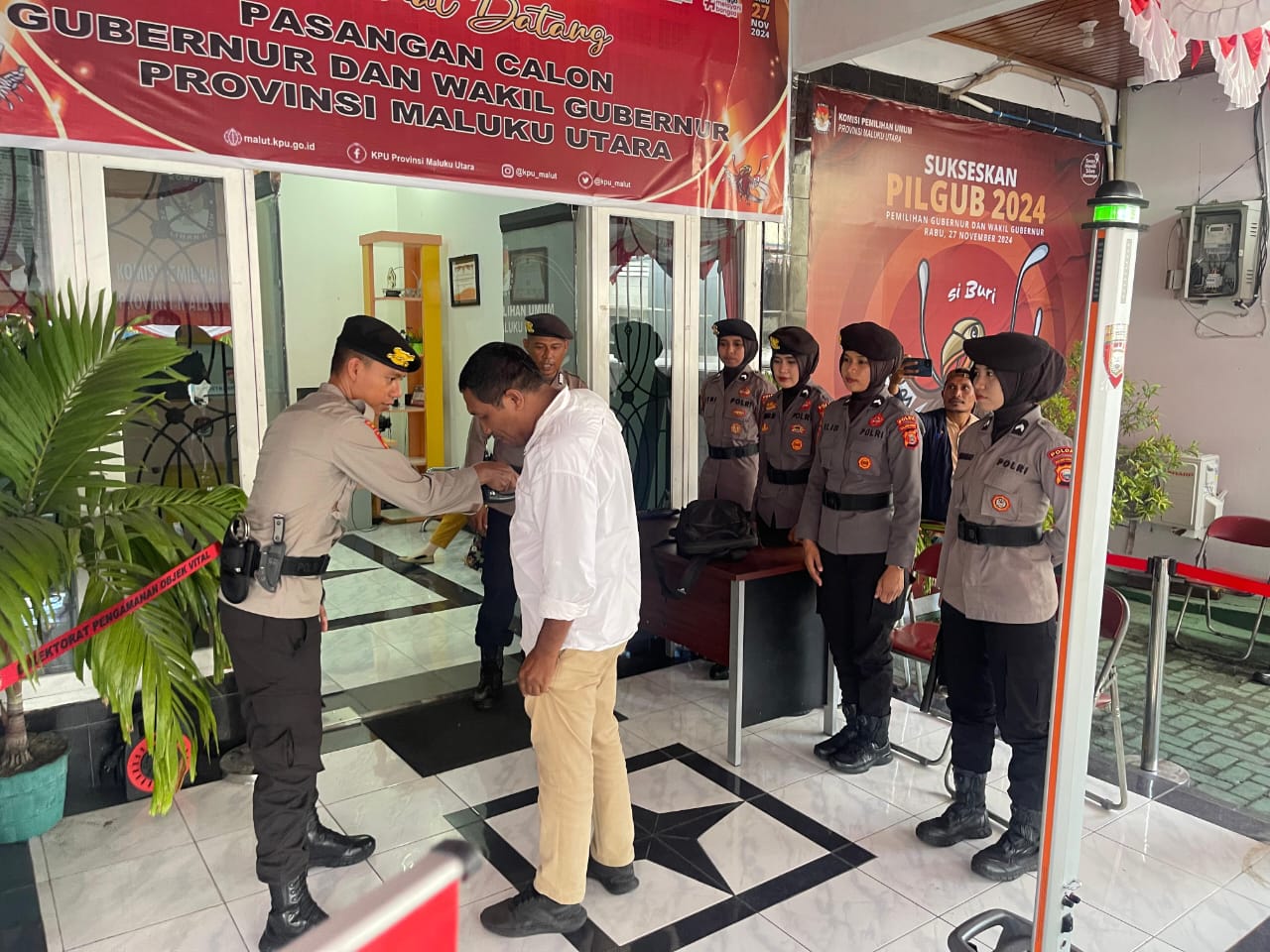 Pada Kamis (17/10/2024), personel Operasi Mantap Praja Kieraha 2024 melaksanakan pengamanan ketat di Kantor KPU Provinsi Maluku Utara, Kelurahan Kota Baru, Kota Ternate, terkait pendaftaran calon gubernur (cagub) untuk Paslon Nomor Urut 4.