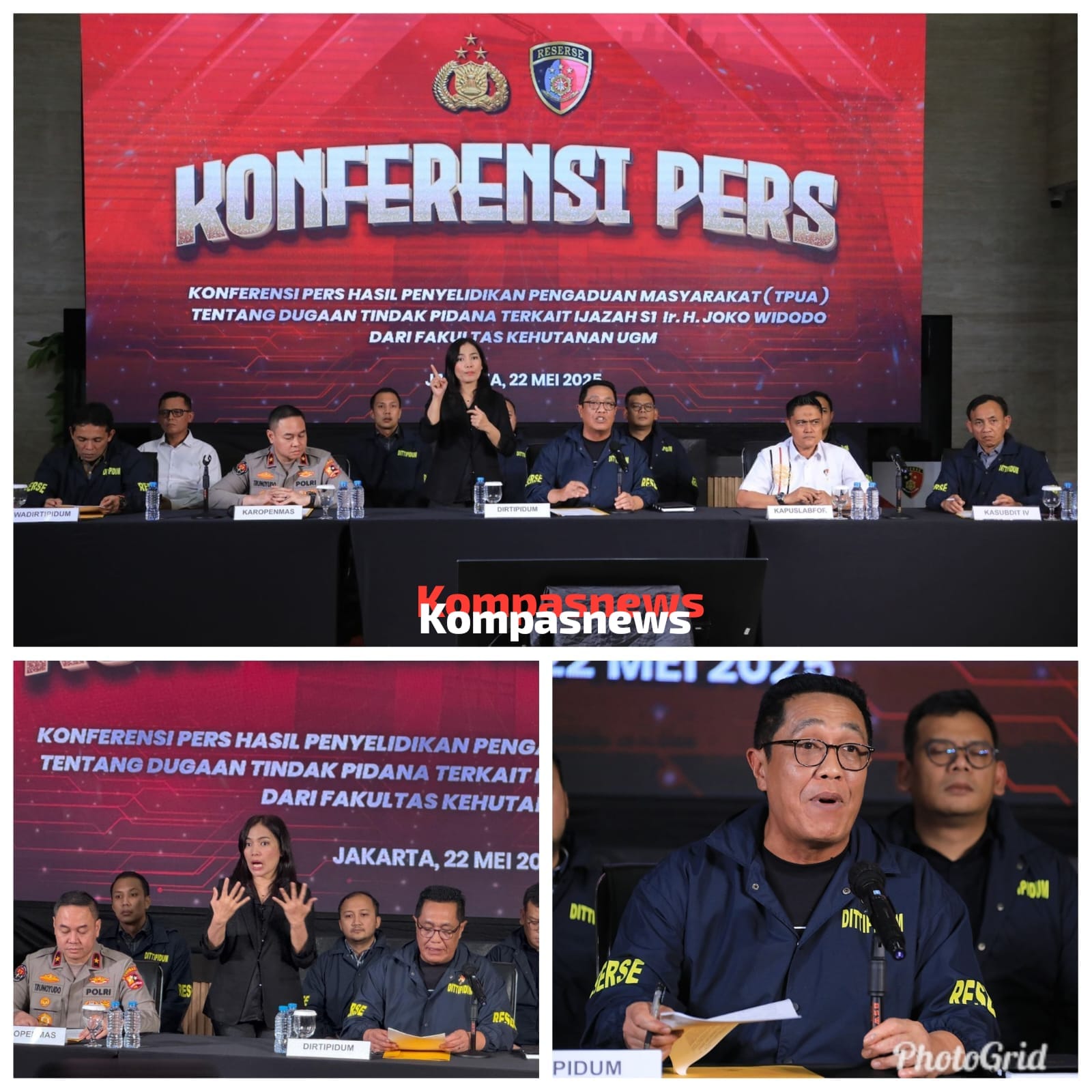 Jakarta – Bareskrim Polri menegaskan bahwa dokumen ijazah Joko Widodo dinyatakan asli dan sah berdasarkan hasil penyelidikan dan uji forensik yang mendalam. Hal ini disampaikan dalam konferensi pers oleh Direktorat Tindak Pidana Umum (Dittipidum) Bareskrim Polri di Lobby Utama Gedung Awaloedin Djamin, Bareskrim Polri, Jakarta, Kamis (22/5).