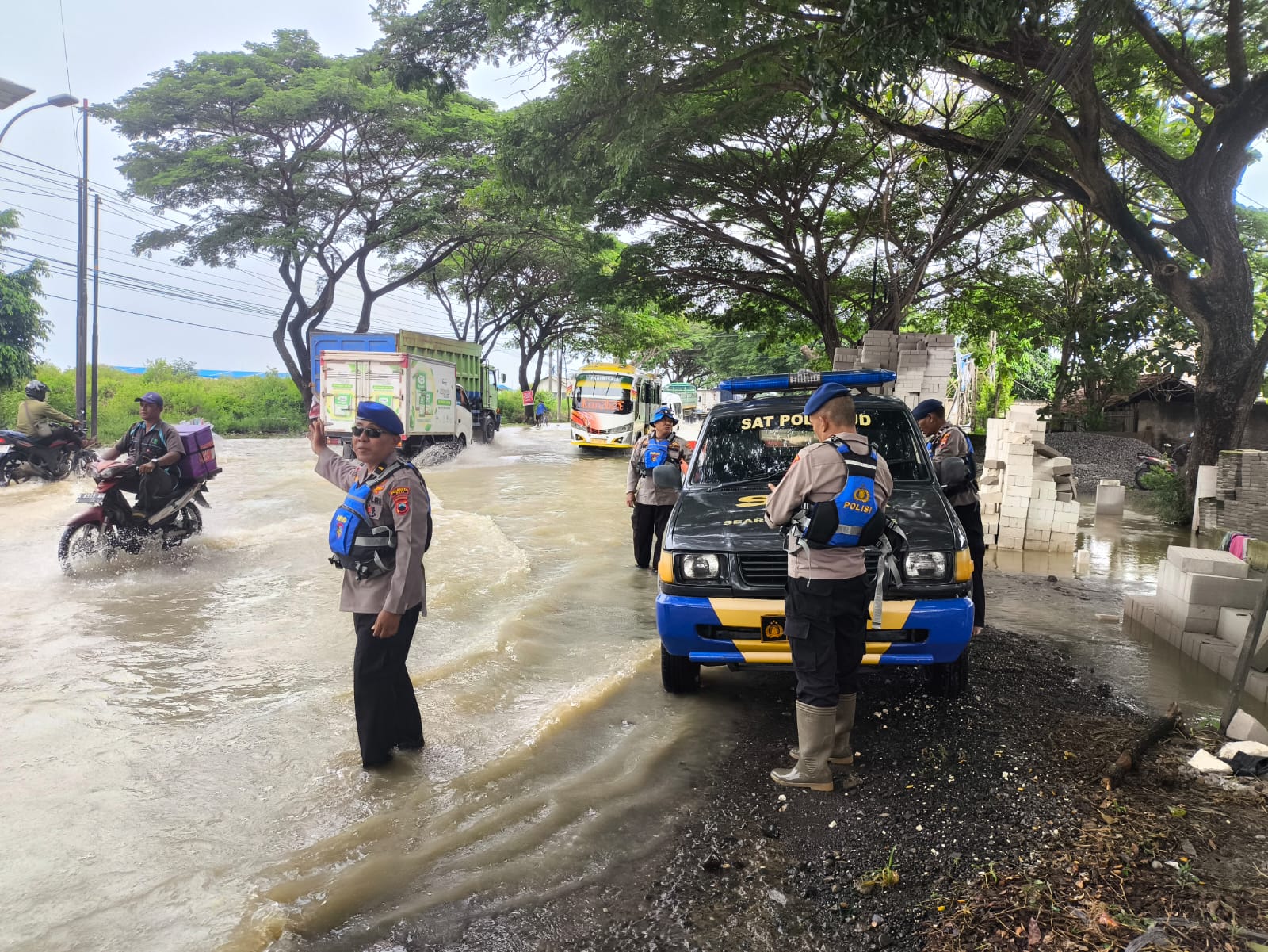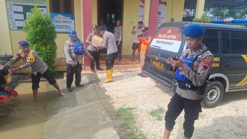 Pati – Jajaran Polsek Batangan bersama personel gabungan dari Sat Samapta, Satlantas, dan Ditpolairud Polresta Pati terus memantau perkembangan banjir di sejumlah titik wilayah Kecamatan Batangan, Kabupaten Pati Jawa Tengah, Senin (27/10/2025) pukul 14.00 WIB hingga selesai. Pemantauan dilakukan untuk memastikan situasi tetap aman dan membantu warga terdampak banjir.