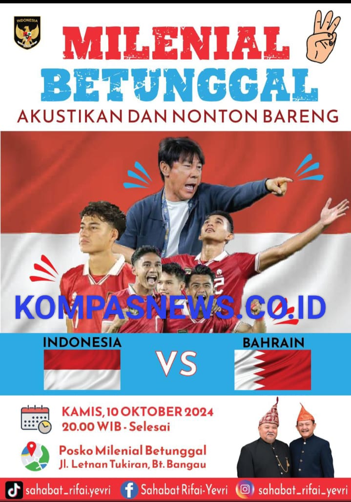 “Nonton bareng Timnas Indonesia melawan Bahrain dalam kualifikasi Piala Dunia 2026 akan diadakan nanti malam. Acara ini terbuka untuk umum dan bakal dihibur oleh akustik dari Tim Milenial Betunggal,” jelasnya.