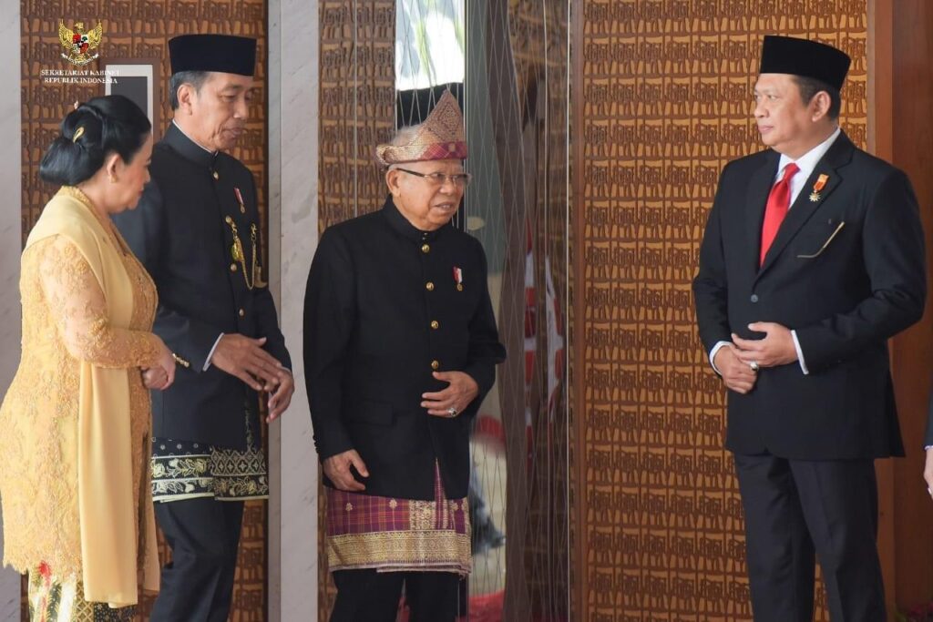 Sedangkan, Wakil Presiden RI Ma’ruf Amin mengenakan pakaian adat khas Melayu Palembang dengan kemeja dan celana panjang berwarna hitam. Ia juga memakai semacam ikat kepala dan kain di pinggang berwarna krem campur merah.