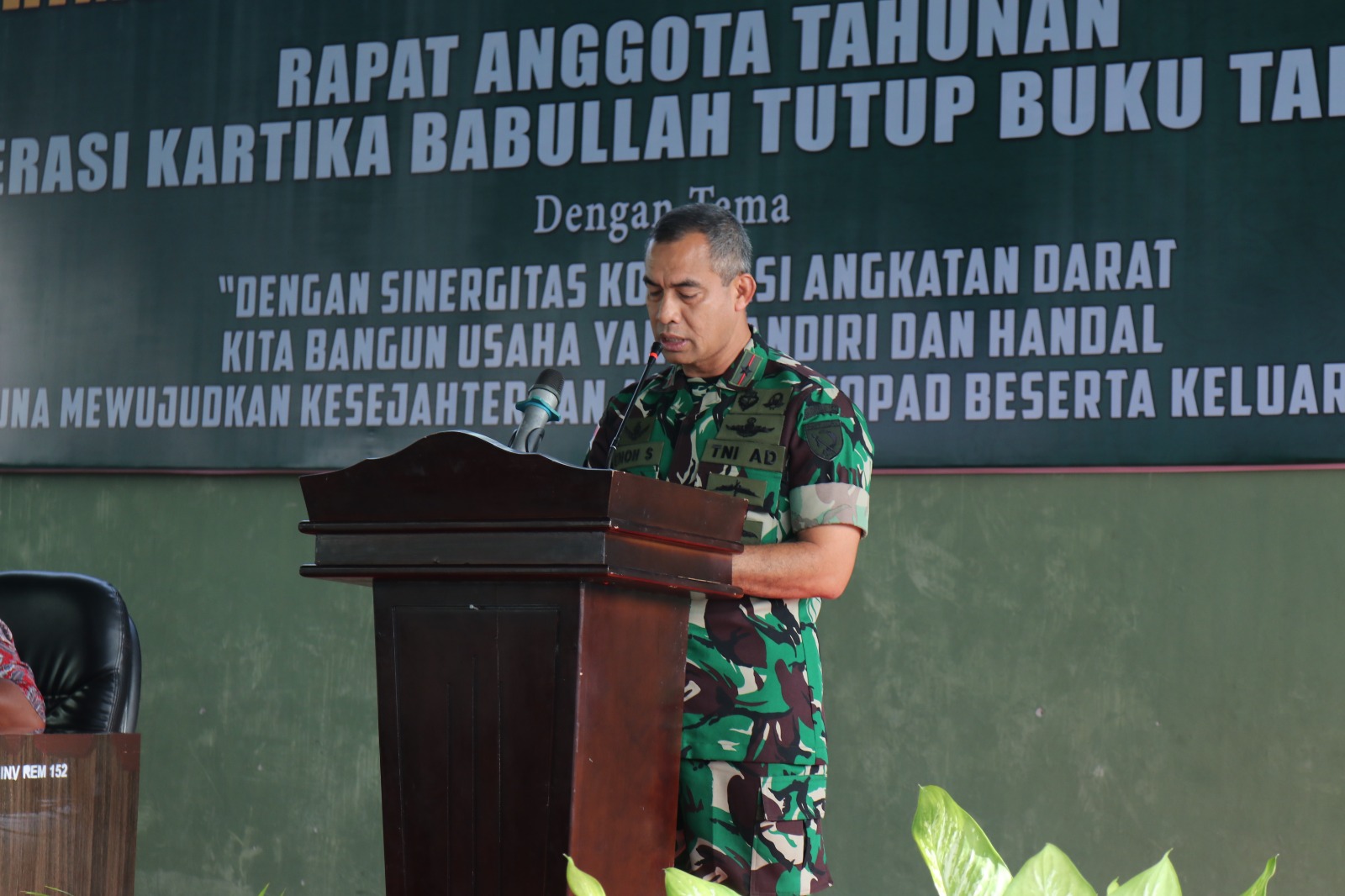 Danrem 152/Baabullah dalam sambutannya menekankan pentingnya koperasi sebagai wadah yang mampu meningkatkan kesejahteraan prajurit dan anggota. Ia berharap kepengurusan baru dapat terus mengembangkan koperasi dengan inovasi serta pengelolaan yang transparan dan profesional.