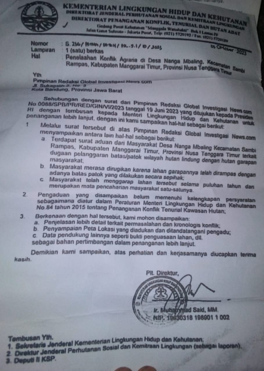 Berdasarkan surat balasan dari Kementerian Lingkungan Hidup dan Kehutanan (KLHK) melalui Direktorat Penanganan Konflik Tenurial dan Hutan Adat memutuskan bahwa permohonan bantuan penyelesaian konflik agraria di Wotok, Desa Nanga Mbaling, Kec. Sambi Rampas belum memenuhi kelengkapan persyaratan sebagaimana diatur dalam Permen. KLHK Nomor 84 tahun 2015 tentang Penanganan Konflik Tenurial Kawasan Hutan.