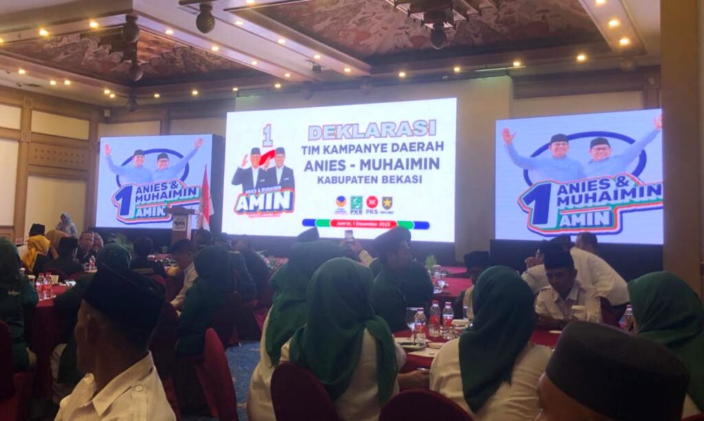 Dalam pantauan wartawan, Deklarasi Tim Kampanye Daerah di Hotel Sahid Lippo Cikarang digelar empat partai politik pengusung pasangan AMIN.