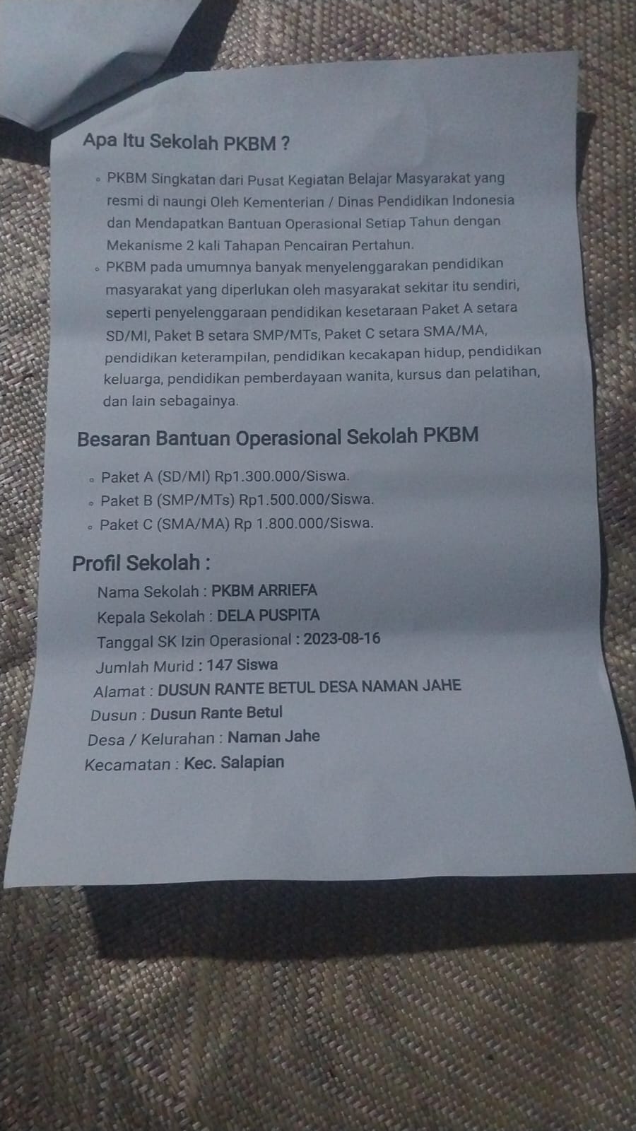 Menurut informasi dari masyarakat dusun Rante Betul, kecamatan Salapian .langkat Keterangan yang di dapat ,PKBM mengajukan ke dinas Pendidikan dengan mencatumkan jumlah murid 147 siswa, ternyata ,setelah di selidiki masyarakat, yayasan tersebut hanya untuk kegiatan anak anak disore hari untuk mengaji.