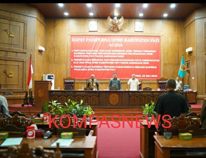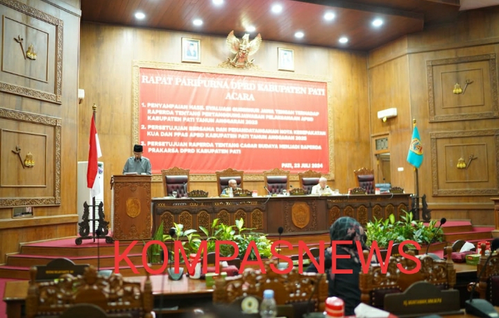 Jateng – Dewan Perwakilan Rakyat Daerah (DPRD) Kabupaten Pati Jawa Tengah, menggelar rapat paripurna, Selasa (23/7). Dua agenda yang dibahas adalah LKPJ (Laporan Keterangan Pertanggungjawaban) evaluasi dari Pj Gubernur Jawa Tengah serta persetujuan Raperda (Rancangan Peraturan Daerah) tentang Cagar Budaya.