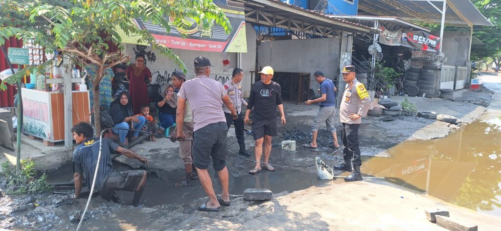Bekasi – Kapolsek Cikarang Pusat, AKP Usep Aramsyah, S.H., M.H., bersama personil Polsek dan masyarakat setempat, menindaklanjuti laporan warga terkait adanya genangan air di turunan Flyover Tegal Danas, Desa Hegarmukti, Kecamatan Cikarang Pusat, Kabupaten Bekasi. Genangan tersebut dikhawatirkan dapat mengganggu arus lalu lintas dan berpotensi membahayakan pengguna jalan. Sabtu (19/10/2024).