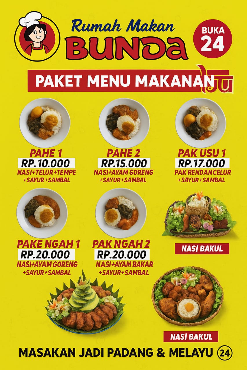 Dengan mengusung konsep Masakan Khas Padang dan Melayu, Rumah Makan Bunda menghadirkan beragam menu lezat seperti rendang, ayam pop, ikan asam padeh, hingga sambal lado hijau yang menggoda. Semua olahan dibuat dari bahan segar pilihan, diracik dengan bumbu tradisional khas Minang dan Melayu yang kaya rasa.