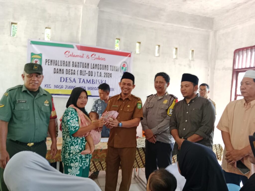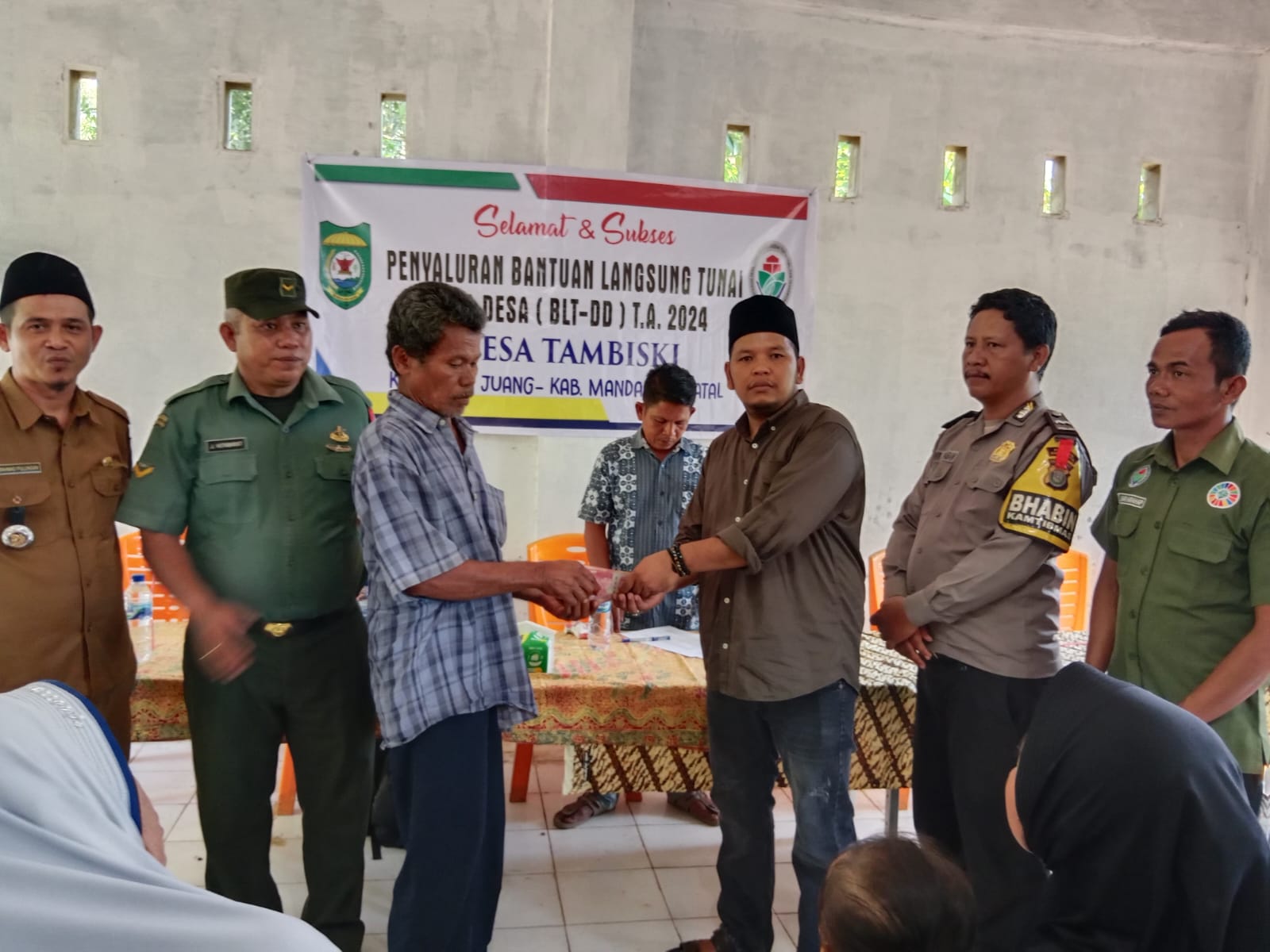 Pemerintah Desa Tambiski Kecamatan Naga juang,Kabupaten Mandailing Natal(Madina),Provinsi Sumatera Utara Menyalurkan Bantuan Langsung Tunai (BLT)tahap l tahun 2024 yang bersumber dari Anggaran Dana Desa terhadap 50 Keluarga Penerima Manfaat(KPM), bertempat di Kantor Kepala Desa Tambiski Senin(06/05/2024).