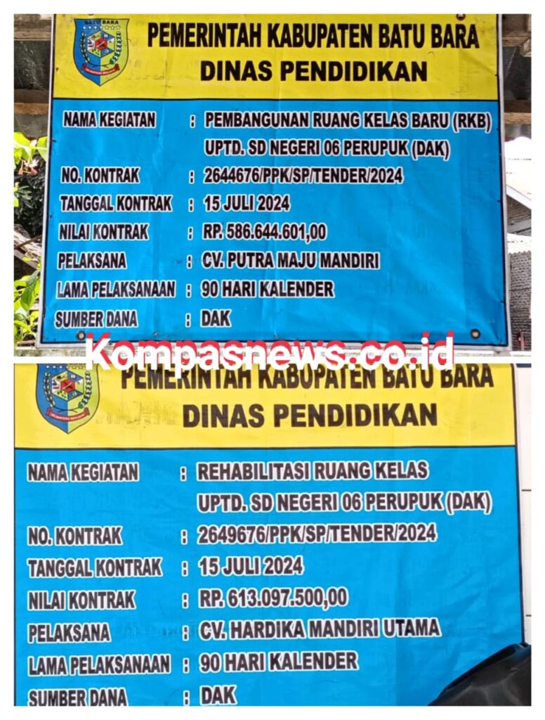 Yang mana Rehabilitasi Ruang Kelas UPTD SD Negeri 06 Perupuk, dengan nomor kontrak 2649676/PPK/SP/Tender/2024, pada tanggal kontrak 15 Juli 2024, juga nilai kontrak sebesar Rp 613.097.500,00, dengan pelaksana CV Hardika Mandiri Utama, dengan lama pelaksanaan kegiatan selama 90 Hari kalender, dari sumber dana DAK, tanpa dari konsultan pengawas.
