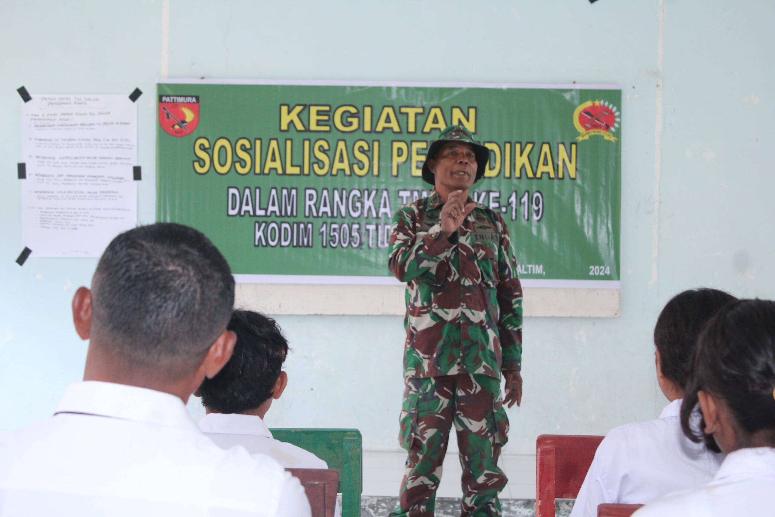Dia mengatakan dengan menggandeng pihak Dinas Pendidikan Kabupaten Haltim. Sosialisasi ini tidak hanya pada materi yang dipahami TNI saja namun nara sumber dari dinas pendidikan ikut membekali dan memberikan pemahaman kepada pelajar pentingnya pendidikan itu sejak dini, serta memberikan pemahaman kepada orang tua siswa tentang peran orang tua terhadap anak.