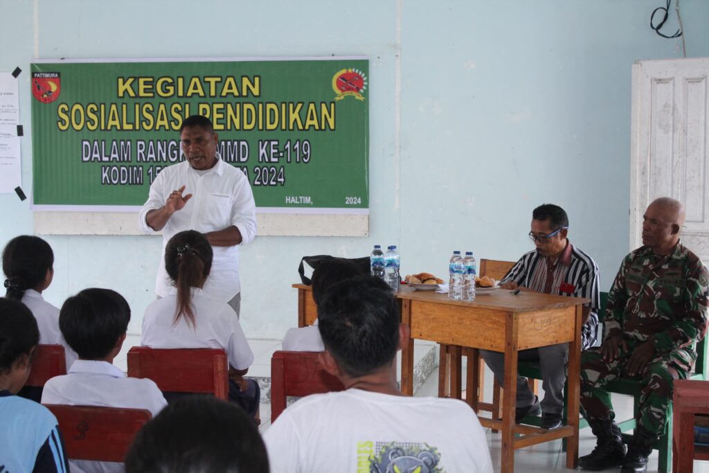 HALTIM | Satgas TNI Manunggal Membangun Desa (TMMD) ke-119, Kodim 1505/Tidore menggandeng Dinas Pendidikan (Disdik) Kabupaten Halmahera Timur (Haltim) dalam memberikan sosialisasi dibidang pendidikan kepada Siswa Siswi SMP, bertempat di ruang Kelas SMPN 6 Satap Maba, Desa Sosolat, Kecamatan Maba Utara, Halmahera Timur, Rabu (06/3/2024).