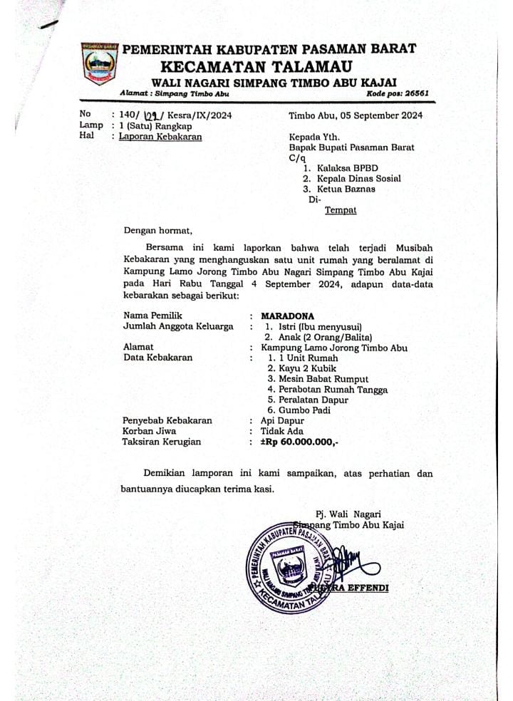 Dia membenarkan telah terjadi kebakaran rumah salah seorang warganya yang Bernama Maradona yang terjadi pada hari Rabu sore 4 september 2024.