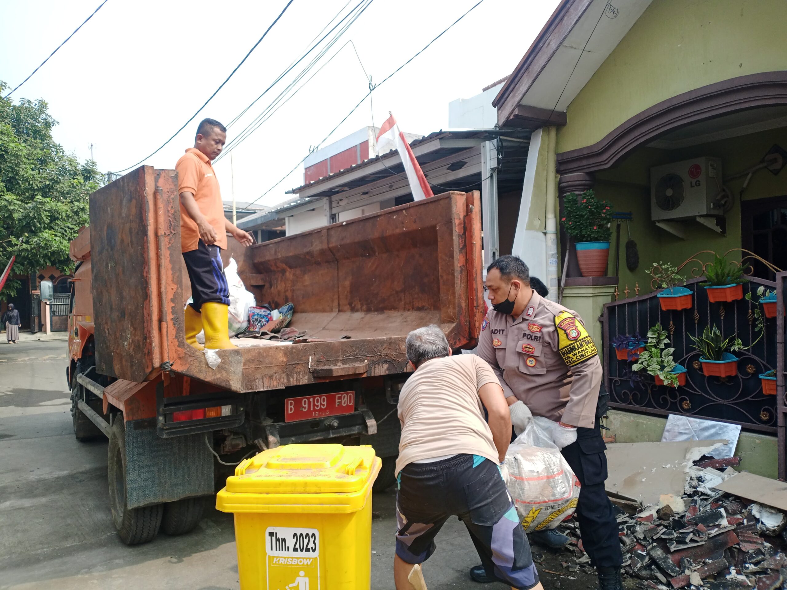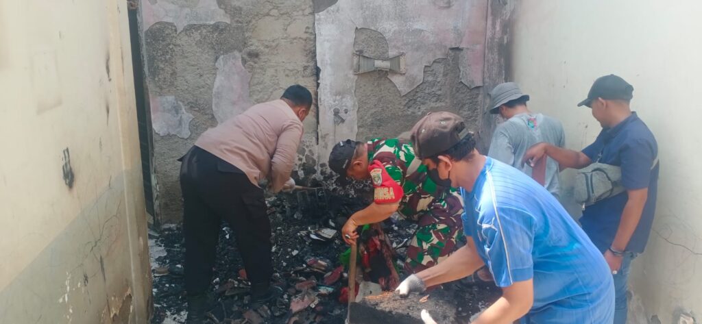 Kab-Bekasi – Bhabinkamtibmas Kelurahan Wanasari Polsek Cikarang Barat, Bripka Aditya C.H, bersama Babinsa turut serta dalam kegiatan kerja bakti di rumah korban kebakaran yang berlokasi di Perumahan Gramapuri Tamansari, Blok F5 RT 05/37 Kelurahan Wanasari, Kecamatan Cibitung, Kabupaten Bekasi, pada Jumat (2/8/2024).