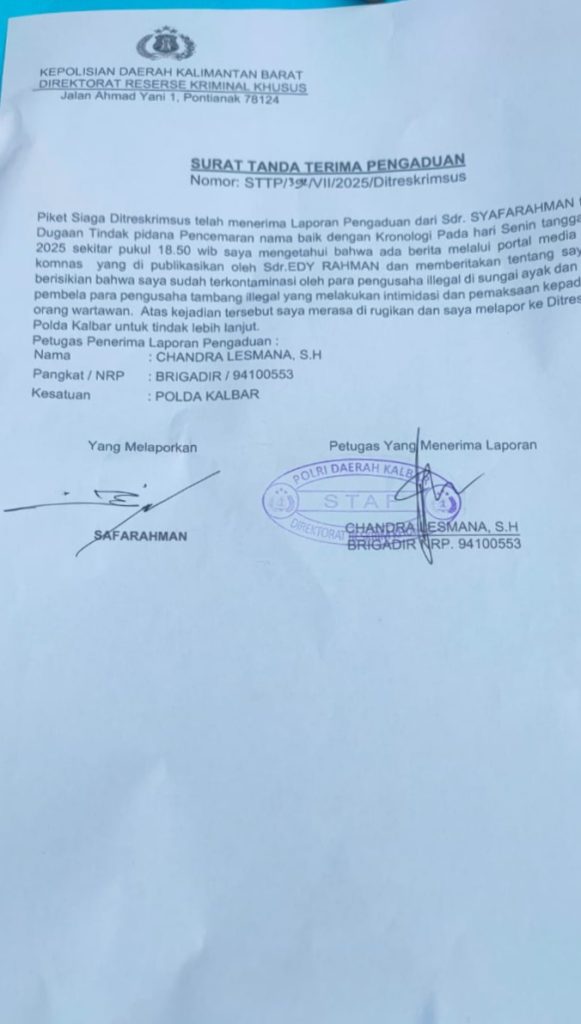 Syafarahman datang langsung ke Polda Kalbar didampingi kuasa hukumnya Asido Jamot Tua Simbolon S.H, Untuk membuat laporan resmi beserta bukti awal yang dimiliki. Laporan tersebut telah diterima pihak kepolisian dan tercatat dengan nomor: STTP/392/Vll/2025/Ditreskrimsus Polda Kalbar..