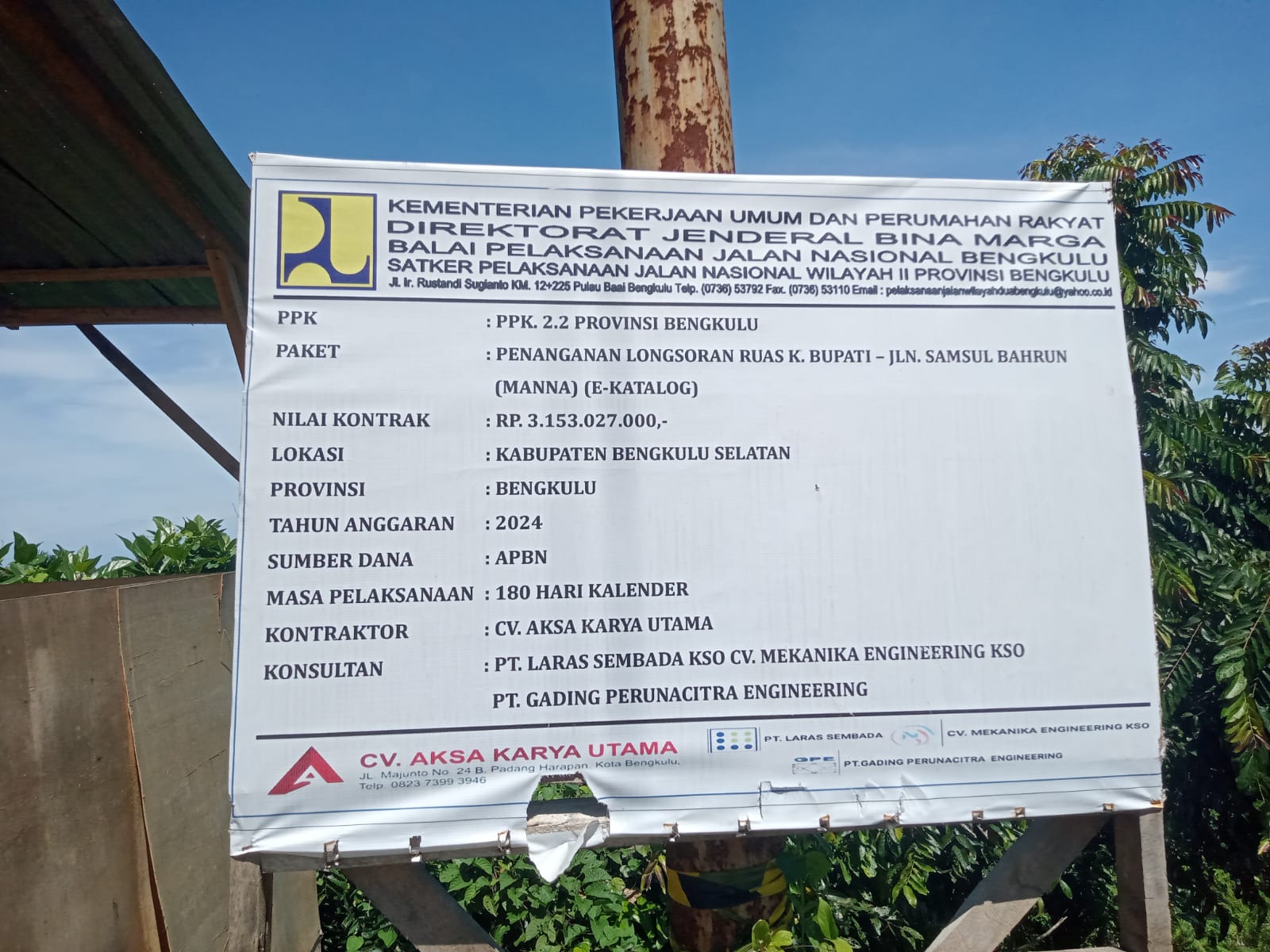 Proyek tersebut berada di bawah pengawasan Balai Pelaksana Jalan Nasional Provinsi Bengkulu. Proyek yang kini sedang di kerjakan patut diduga sejak dimulainya pekerjaan hingga saat ini tidak melengkapi sejumlah pekerja dan pengamanan barang karena peralatan K3 yang seharusnya ada tidak tersedia.