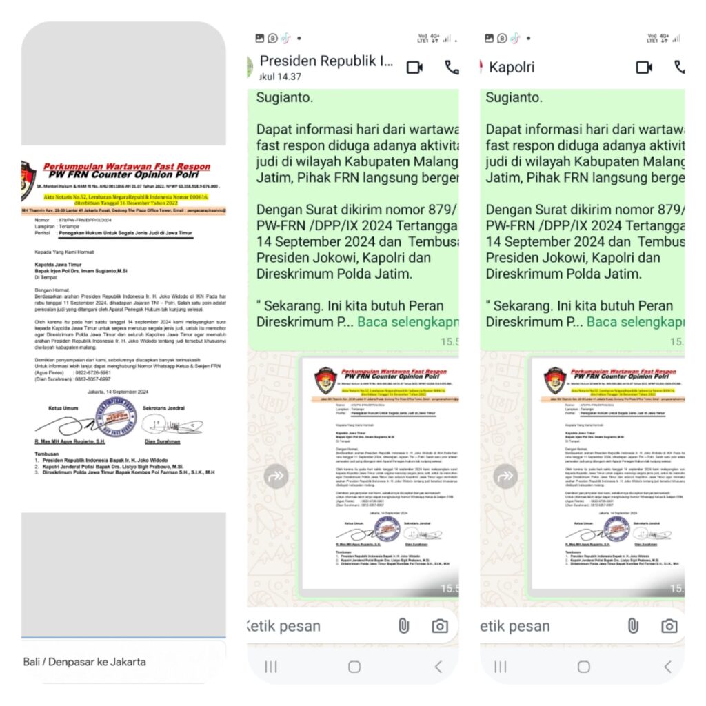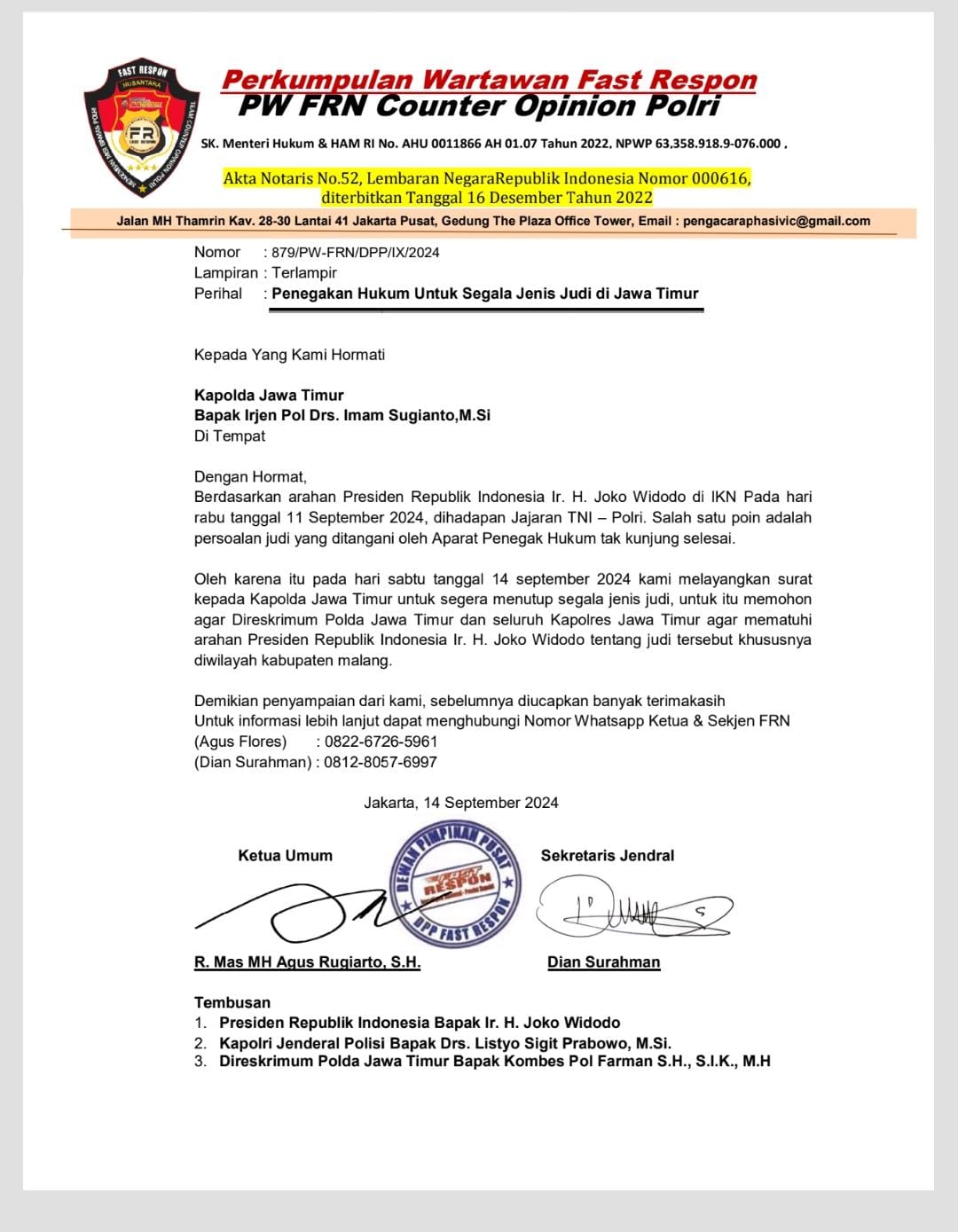 Dengan Surat dikirim nomor 879/PW-FRN /DPP/IX 2024 Tertanggal 14 September 2024 dan Tembusan Presiden Jokowi, Kapolri dan Direskrimum Polda Jatim.