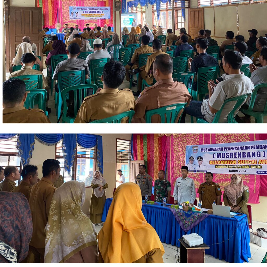 Wakil Bupati Risnawanto didampingi Asiten III Raf’an, Kepala OPD serta stakeholder terkait, membuka Musyawarah Perencanaan Pembangunan (Musrenbang) Tahun 2024 untuk Rencana Kerja Pembangunan Daerah (RKPD) Tahun 2025 Kecamatan Sungai Aur, yang diselenggarakan di Aula Kantor Camat Sungai Aur, Senin (19/2).