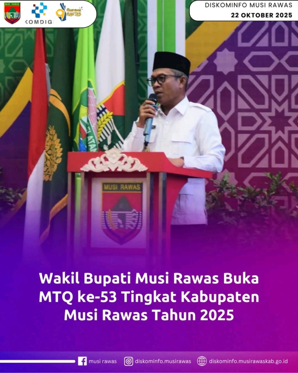 Musi Rawas – Wakil Bupati Musi Rawas H. Suprayitno secara resmi membuka kegiatan Musabaqah Tilawatil Qur’an (MTQ) Ke-53 Tingkat Kabupaten Musi Rawas Tahun 2025 di Gedung Auditorium Pemkab Musi Rawas pada Rabu, 22 Oktober 2025.