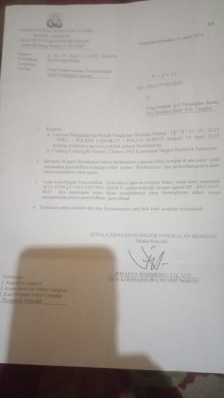 Cuma apakah berani Kapolres Langkat melalui Polsek Pangkalan Brandan kembali konfirmasi ke PJU polres Langkat yang dituding ada indikasi terkait dalam pelemparan bom molotov di kediaman saya.
